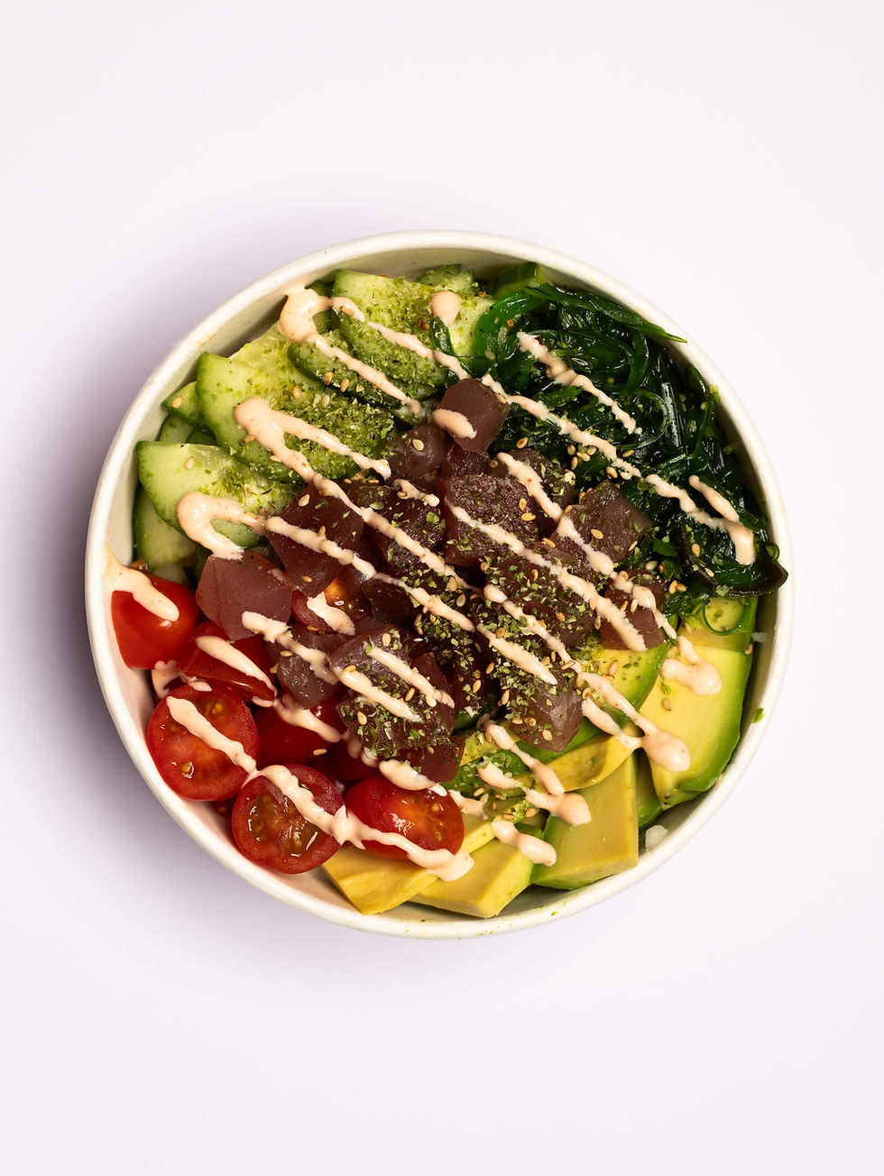 thon cru, avocat, tomates cerises, concombres, salade d'algue, furikake, sauce mayo spicy