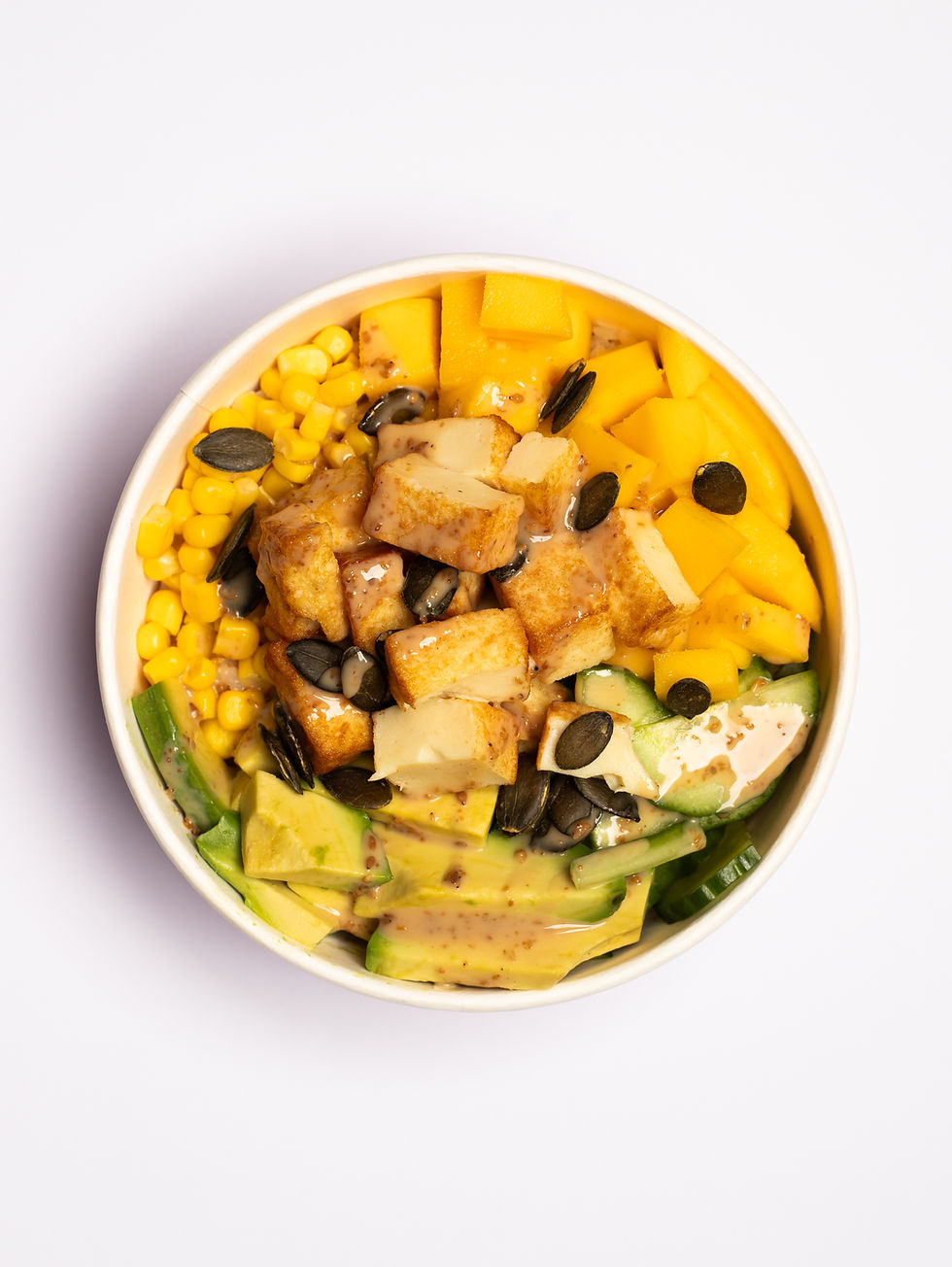 riz vinaigré, quinoa ou salade mêlée, tofu, avocat, mangue, concombres, maïs, graine de courge, vinaigrette sésame