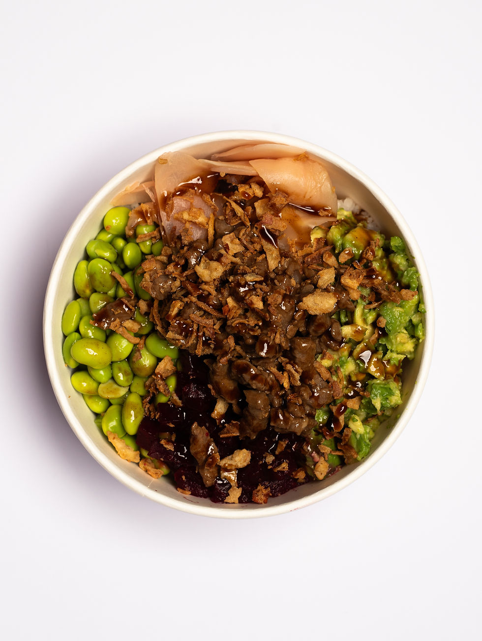 riz vinaigré, quinoa, salade mêlée, tataki de boeuf, edamame, betterave, avocat, gingembre, oignons frits, sauce katsu